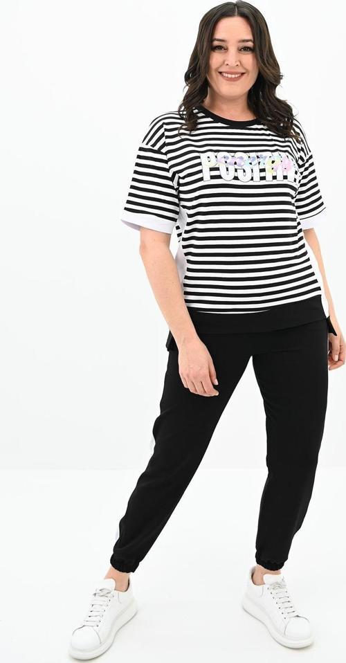 Rahatlığı ve şıklığı bir araya getiren Kadın Büyük Beden Çizgili Eşofman Takımı, 42-50 bedene uyumludur.