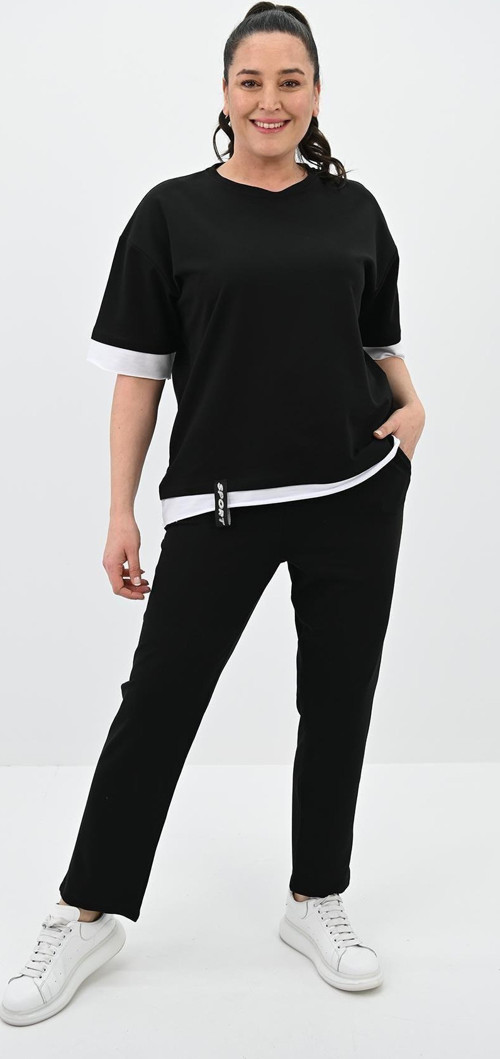 Koza Butik Kadın Büyük Beden Kısa Kollu Şerit Detaylı Eşofman Takımı 8098-24 Siyah 3XL