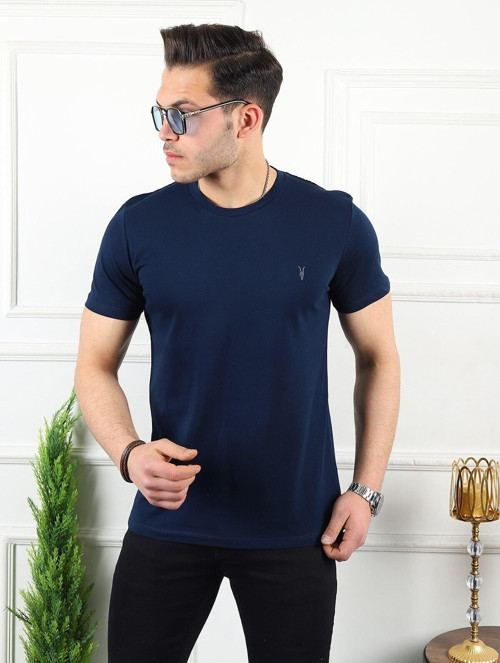 Erkek Lacivert Standart Kesim Bisiklet Yaka %100 Pamuk Kısa Kollu Erkek Tişört T-Shirt Mankenin Üzerindeki M Bedendir .