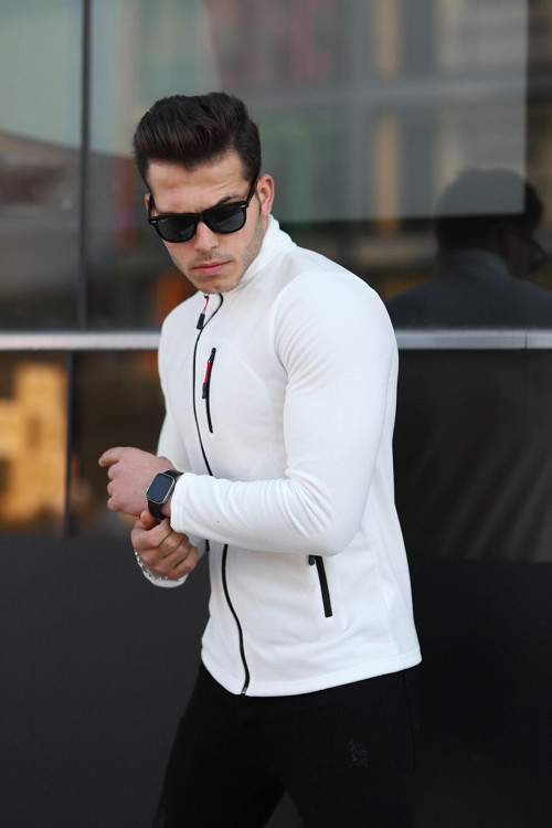 Kozik Erkek Siyah Polar Kışlık Kalın Tam Fermuar Pamuklu Kumaş Polar Ceket Beyaz M