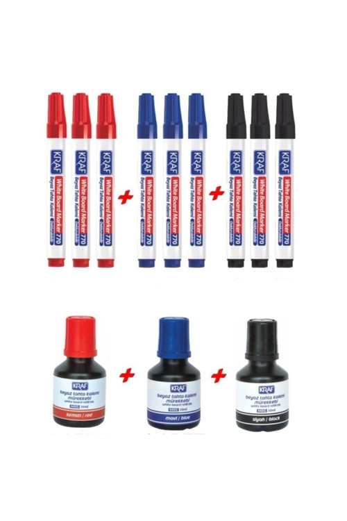 1 x Kırmızı Kraf Tahta Kalem Mürekkebi 30ml 1 x Mavi Kraf Tahta Kalem Mürekkebi 30ml 1 x Siyah Kraf Tahta Kalem Mürekkebi 30ml 1 x Kraf 770 Doldurulabilir Beyaz Tahta Kalemi - Kırmızı 1 x Kraf 770 Doldurulabilir Beyaz Tahta Kalemi - Mavi 1 x Kraf 770 Doldurulabilir Beyaz Tahta Kalemi - Siyah Ürün Açıklaması Hafif kokulu, Kalemler doldurulabilir özelliktedir, Uzun süreli yazım kolaylığı, Leke ve iz bırakmaz, Kolay silinir, Hemen kurur,