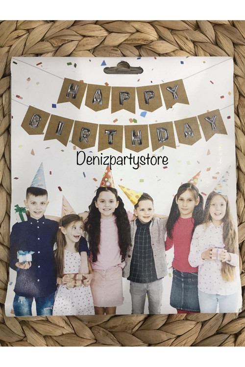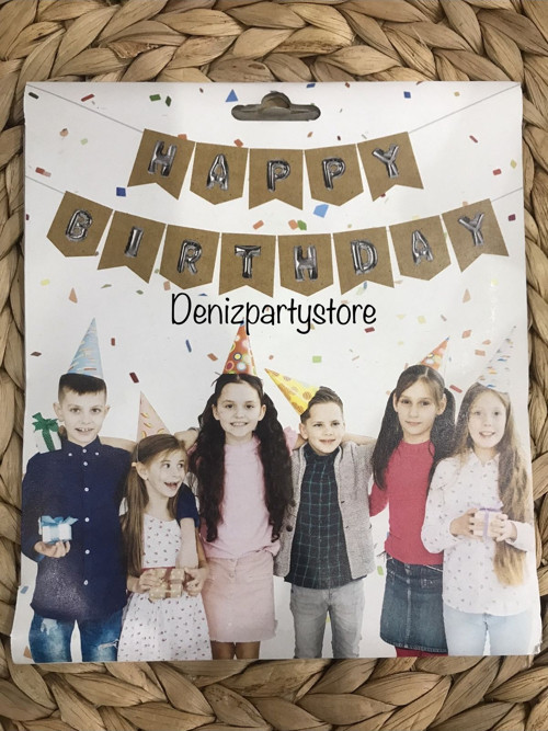 Kraft gümüş folyo harf balon görünümlü baskı happy bırthday banner Harf boyutu 14cm x16 cm dir Toplam uzunluk ortalama 200 cm dir.