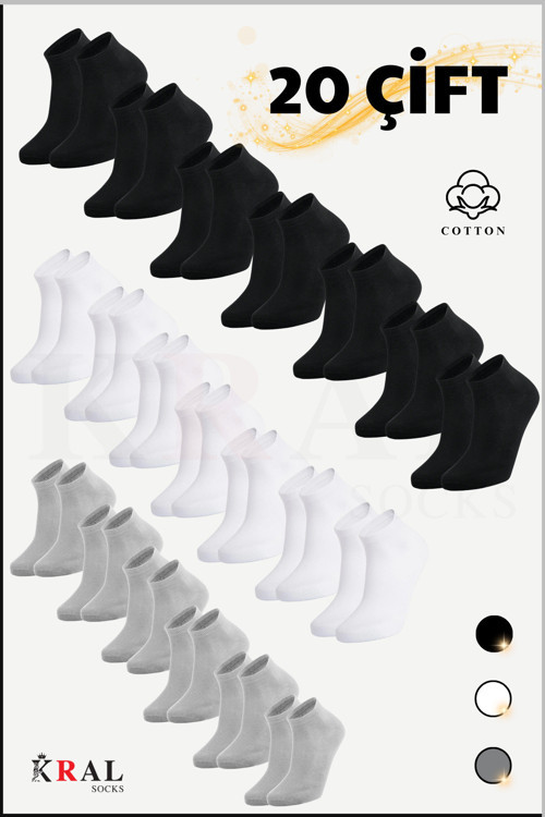 - 20 çift siyah, beyaz ve gri renkteki düz desenli patik çoraplarla günlük kullanımınızda şıklığı ve rahatlığı bir arada yaşayın.