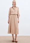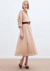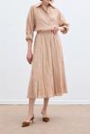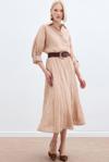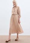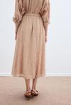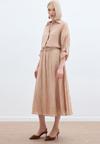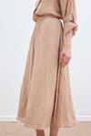 Yüksek bel, yan fermuarlı, iç astarlı, midi boy, kraşlı kloş etek.