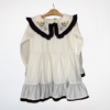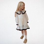 Klasik şıklığın modern bir yorumu olan bu kız çocuk elbisesi, zarif nakış detayları ve fırfırlı yakasıyla dikkat çekiyor. Krem tonları üzerine yerleştirilen çiçek motifleri, elbiseye nostaljik ve sıcak bir hava katarken, fırfırlı kol ucu ve etek ucu detaylarıyla da vintage bir duruş sunar. Hem özel günlerde hem de günlük şıklıkta tercih edilebilir.