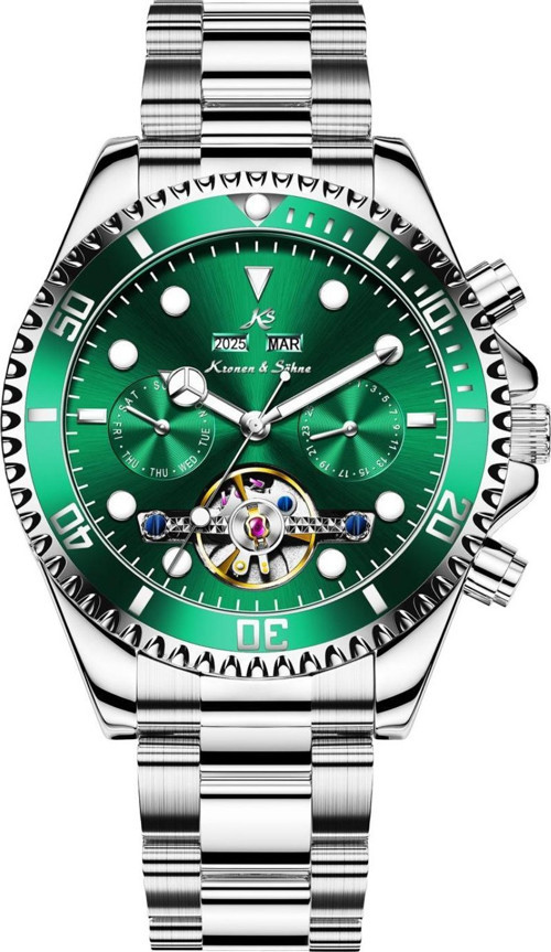 - Kasa Çapı: 42.8 mm, yuvarlak parlak bir kasa. Zümrüt yeşili bezel.