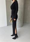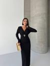 Elbisenin kruvaze detayı, vücut hatlarını zarif bir şekilde vurgularken, bel kısmındaki aksesuarlar ile şıklığı artırmaktadır. Uzun kesimi, hem günlük hem de özel davetlerde rahatlıkla tercih edilebilecek bir seçenek sunar.
