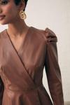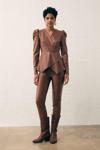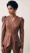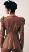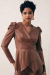 Uzun ve balon kol, asimetrik volanlı kesim, arka fermuarlı kapama, kruvaze deri bluz.