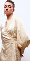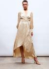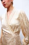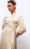 Kruvaze yaka, manşetli, asimetrik kesim, kendinden desenli uzun elbise.