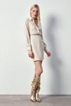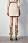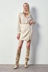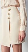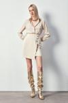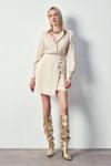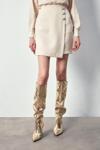 Kruvaze detay, süs düğmeli, arka fermuarlı kapama, mini etek.