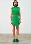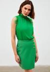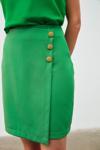 Kruvaze detay, süs düğmeli, arka fermuarlı kapama, mini etek.