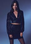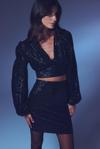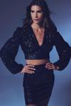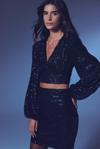 Kruvaze yaka, kol ucu lastikli ve balon kol, vatkalı, içi astarlı, yan fermuarlı, payetli crop bluz.