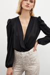 Kruvaze yaka, vatkalı, uzun kol ucu lastikli, alt çıtçıtlı, saten bodysuit.