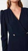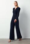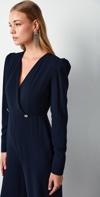 Kruvaze yaka, fermuarlı kol, arka fermuarlı kapama, geniş paça, vatkalı, tam kalıp, taş detaylı krep tulum.