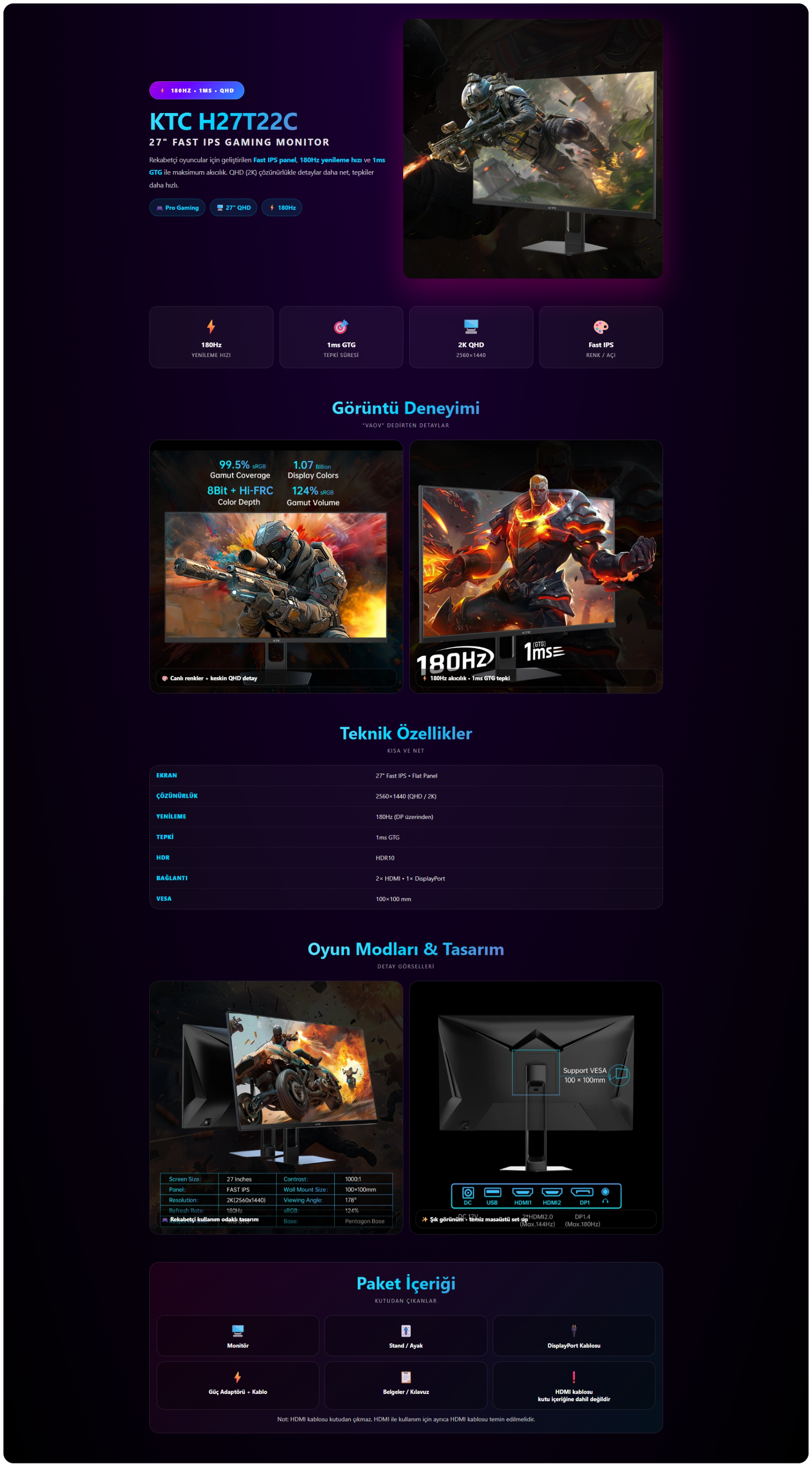 KTC 27'' H27T22C 180Hz 1Ms (HDMI+DisplayPort) 2560 x 1440 Freesync Fast IPS Flat Monitör