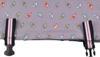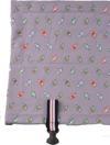 Gri kumaş zemini üzerine renkli kuş baskıları vardır