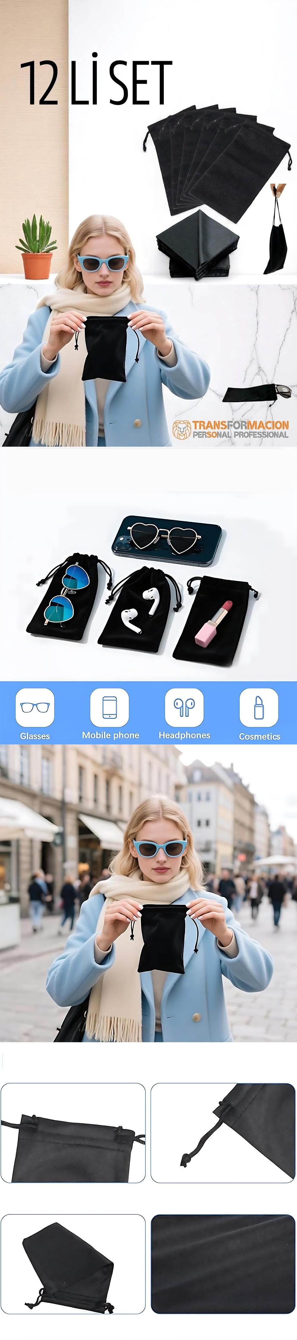 "Çekme ipli gözlük kılıfı 12'li paket, gözlüklerinizi çizilmelere ve toza karşı koruyarak uzun ömürlü kullanım sunar. Mikrofiber silme bezli gözlük koruma seti, gözlüklerinizi temizlemeniz için ekstra bezlerle birlikte gelirken, profesyonel optik aksesuar koruma kılıfı, büyük ölçekli işletmeler ve toplu kullanım için mükemmel seçimdir!"
