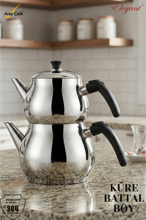 Küre serisi battal boy siyah bakalit kulplu çaydanlık takımı, geniş hacmi ve şık detaylarıyla kalabalık aileler ve yoğun kullanım için idealdir. 304 paslanmaz çelik gövdesi uzun ömürlü ve dayanıklı kullanım sunar. Siyah bakalit kulplar, ısıyı iletmeyen yapısıyla güvenli tutuş sağlarken modern bir görünüm kazandırır.