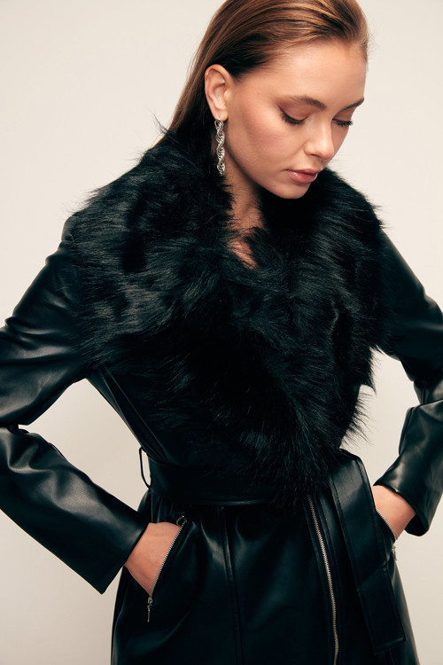 Yan fermuarlı kapama, fermuarlı cep, astarlı, kalça altı boy, bel kuşaklı, çıkarılabilir yaka kürklü deri ceket.