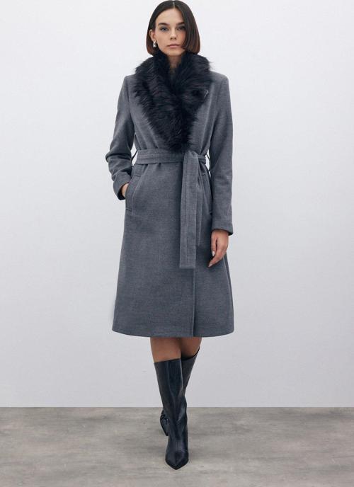 Kruvaze yaka, düz uzun kol, cepli, iç astarlı, bel kuşaklı, çıkarılabilir kürklü kaşe kaban.