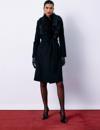 Kruvaze yaka, düz uzun kol, cepli, iç astarlı, bel kuşaklı, çıkarılabilir kürklü kaşe kaban.