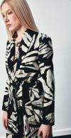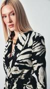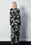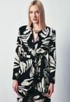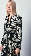 Ön düğmeli, vatkalı, uzun düz kol, iç astarlı, bel kuşaklı, çiçek desenli saten uzun ceket.