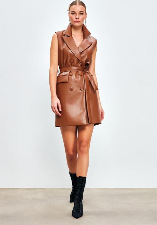 Kruvaze, kolsuz, astarlı, kapaklı süs cep, ön düğmeli kapama suni deri kuşaklı yelek.