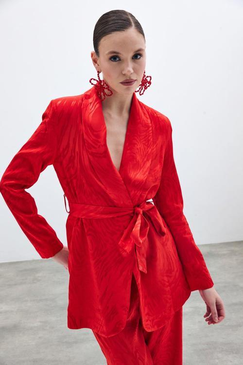 Ceket yaka, vatkalı, uzun ve geniş kol, astarlı, ön tek düğmeli, kuşaklı, kalça altı boy, desenli salaş ceket.