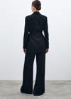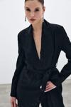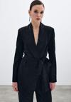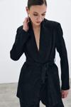Ceket yaka, vatkalı, uzun ve geniş kol, astarlı, ön tek düğmeli, kuşaklı, kalça altı boy, desenli salaş ceket.