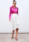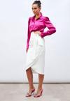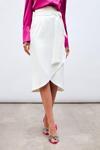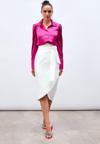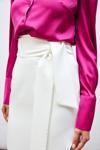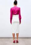 Yüksek bel, arka fermuarlı, kruvaze detay, kuşaklı kalem etek.