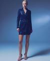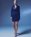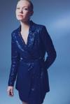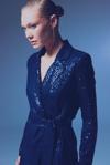 Kruvaze yaka, vatkalı, uzun kol, iç astarlı, kuşaklı payet ceket.