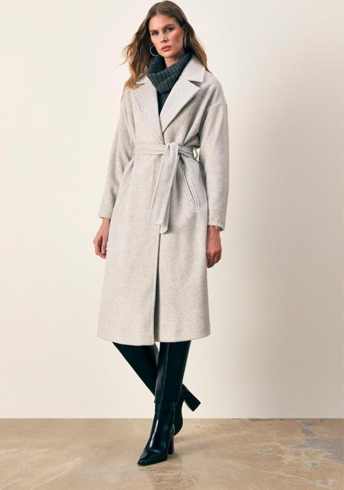 Kruvaze, geniş uzun kol, içi astarlı, cepli, kuşaklı salaş uzun kaban.