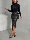 Şıklık ve zarafetin buluştuğu Kuşaklı Uzun Deri Etek, gardırobunuzun vazgeçilmezi olmaya aday. Hem günlük hayatta hem de özel davetlerde şıklığınızı tamamlayacak şık bir seçenektir.