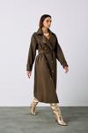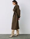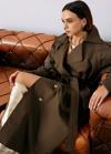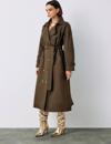 Kruvaze yaka, ön düğmeli kapama, cepli, kemerli uzun kol, arka yırtmaçlı, kuşaklı uzun trenç.
