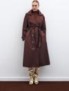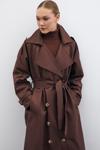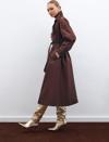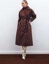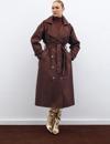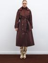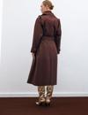Kruvaze yaka, ön düğmeli kapama, cepli, kemerli uzun kol, arka yırtmaçlı, kuşaklı uzun trenç.