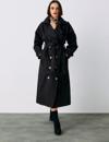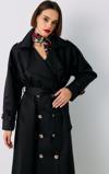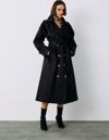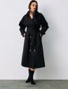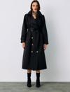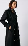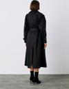 Kruvaze yaka, ön düğmeli kapama, cepli, kemerli uzun kol, arka yırtmaçlı, kuşaklı uzun trenç.