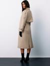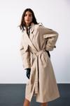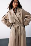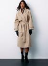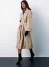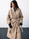 Ceket yaka, geniş cepli, geniş çıtçıt kuşaklı uzun kol, iç astarlı, arka yırtmaçlı, bel çıtçıt kuşaklı uzun trençkot.