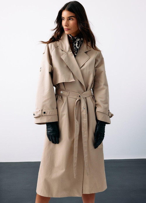 Ceket yaka, geniş cepli, geniş çıtçıt kuşaklı uzun kol, iç astarlı, arka yırtmaçlı, bel çıtçıt kuşaklı uzun trençkot.