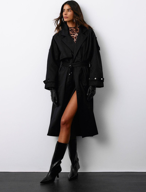 Ceket yaka, geniş cepli, geniş çıtçıt kuşaklı uzun kol, iç astarlı, arka yırtmaçlı, bel çıtçıt kuşaklı uzun trençkot.