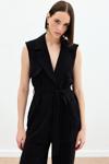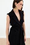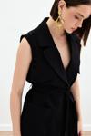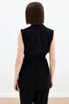 Kruvaze yaka, ön tek düğmeli, cepli, kolsuz, kalça alt boy, astarsız, kuşaklı uzun yelek.