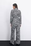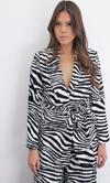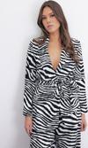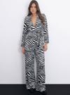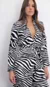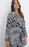 Kruvaze yaka, düz ve geniş kol, iç astarlı, vatkalı, ön tek düğmeli, zebra desenli, kuşaklı uzun ceket.