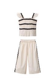 Zarif tasarımıyla dikkat çeken kız çocuk ikili takım, yaz kombinlerinin en şık parçalarından biri olacak. Fırfırlı askılı bluzu ve yanları siyah biyeli bol kesim pantolonu ile hem konforlu hem de modern bir görünüm sunar. Günlük kullanımda, tatilde veya özel davetlerde rahatlıkla tercih edilebilir.