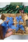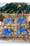 - Zarif inci detaylarıyla süslenmiş, mavi keten kurdeleler, şıklığınızı tamamlar.