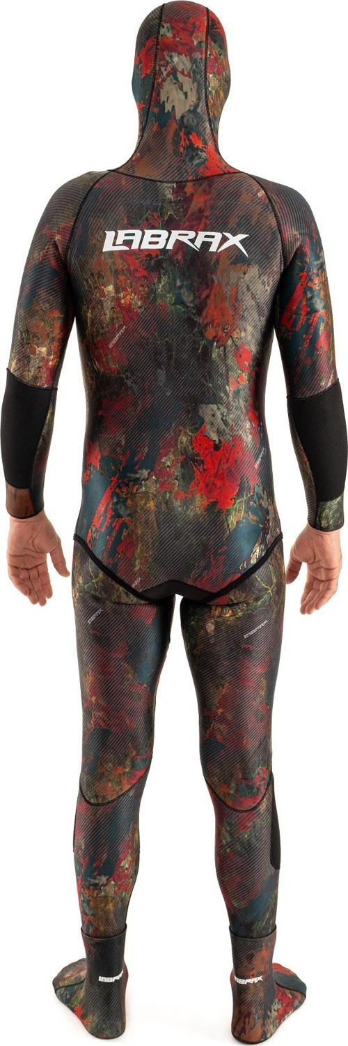 Muhteşem yumuşak kumaşı, 4 yöne esneyen,su tutmayan esnek licrası ile konfor üst düzeyde tutulmuştur. Her türlü zemine uyum sağlayan bukelamun kamuflaj yapısı ile derine indikçe ışık kırılması ile renkler zemin rengine uyum sağlar. Dış yüzey jarse kamuflaj kaplı, iç yüzey opencell (ıslak giyim) yüzeye sahiptir. Ayak ve kol bileklerinde güçlendirilmiş dikiş. Kolay zıpkın kurabilmek için yumuşak ve kaymaz LABRAX ped. Kıyafetlerde soft jako neopren kumaş kullanılmaktadır.