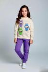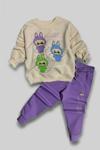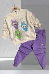 Üst kısmında renkli Labubu karakter baskısı bulunan sweatshirt, alt kısmında ise uyumlu baskı detaylı lila