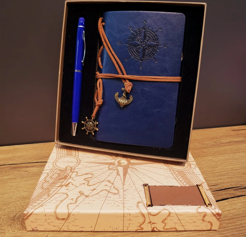 1 Adet Lacivert Pusula Tasarım Deri Defter Ve Tükenmez Kalem Seti