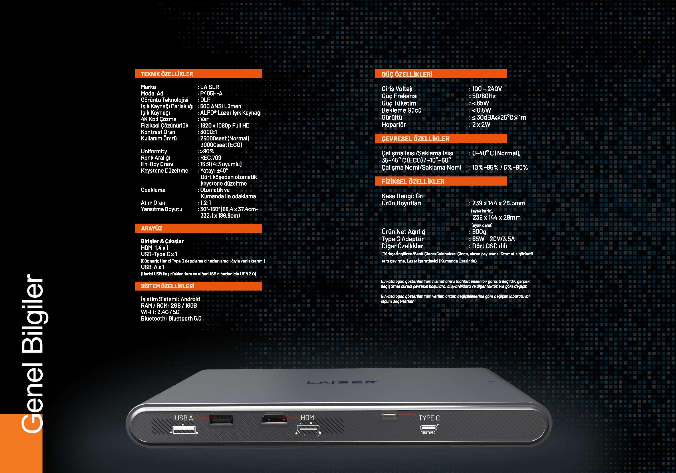 Model Adı: P405H-AGörüntü Teknolojisi: DLPIşık Kaynağı Parlaklığı: 500 ANSI LümenIşık Kaynağı: ALPD® Lazer KaynağıNative Çözünürlük: 1920 x 1080 FullHDKontrast Oranı: 3000:1Kullanım Ömrü: 30000 SaatUniformity: >90%Renk Aralğı: REC.709En-Boy Oranı: 16:9 (4:3 uyumlu)Keystone Düzeltme: Yatay: ±40°, Dört köşeden keystoneOdaklama: Otomatik & Motorlu odaklamaAtım Oranı: 1.2:1Yansıtma Boyutu: 30”-150” (66,4 x 37,4cm - 332,1 x 186,8cm)ARAYÜZ