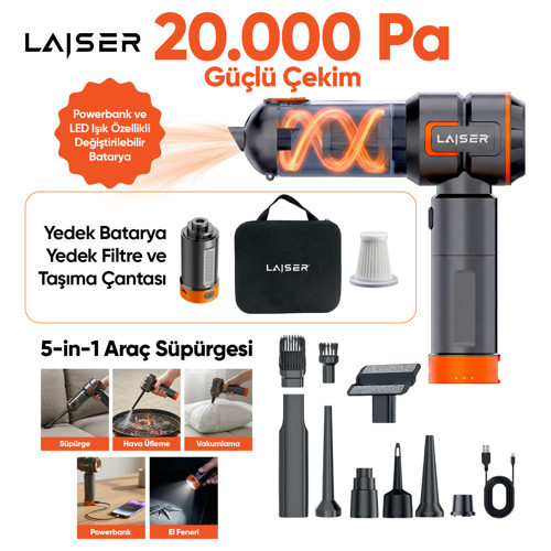 Laiser VT-120 5-in-1 Kablosuz Araç Süpürgesi: 20.000 Pa Güç & Değiştirilebilir 2 Bataryalı (Powerbank ve LED Işık Özellikli)