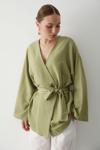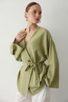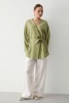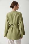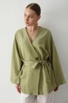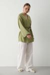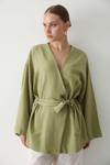 Laluvia Haki Pamuklu Düğme Detaylı Kemerli Keten Kimono