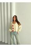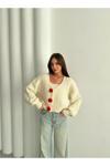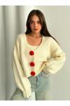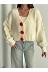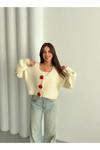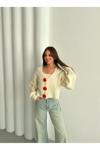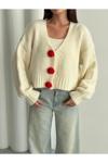 Laluvia Krem - Kırmızı Çiçek Düğmeli Hırka - 4686